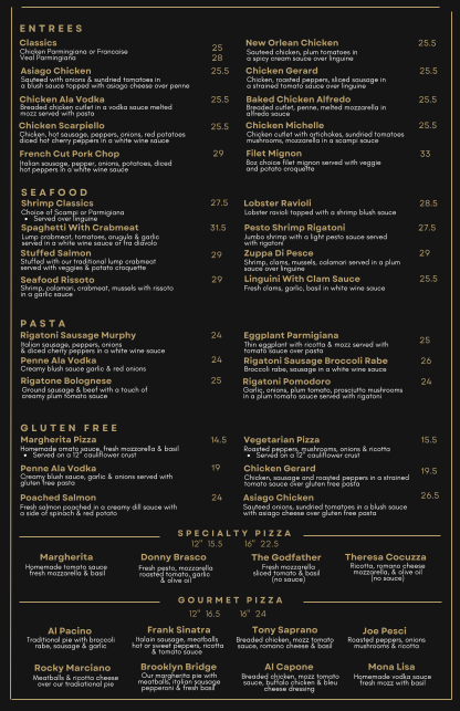 All Day Gluten Free selections feature dishes like Chicken Gerard, Penne Ala Vodka, Asiago Chicken, Zuppa Di Mussels (Appetizer), and Eggplant Ala Seasons (Appetizer), accommodating guests with gluten sensitivities while maintaining an Italian culinary focus.