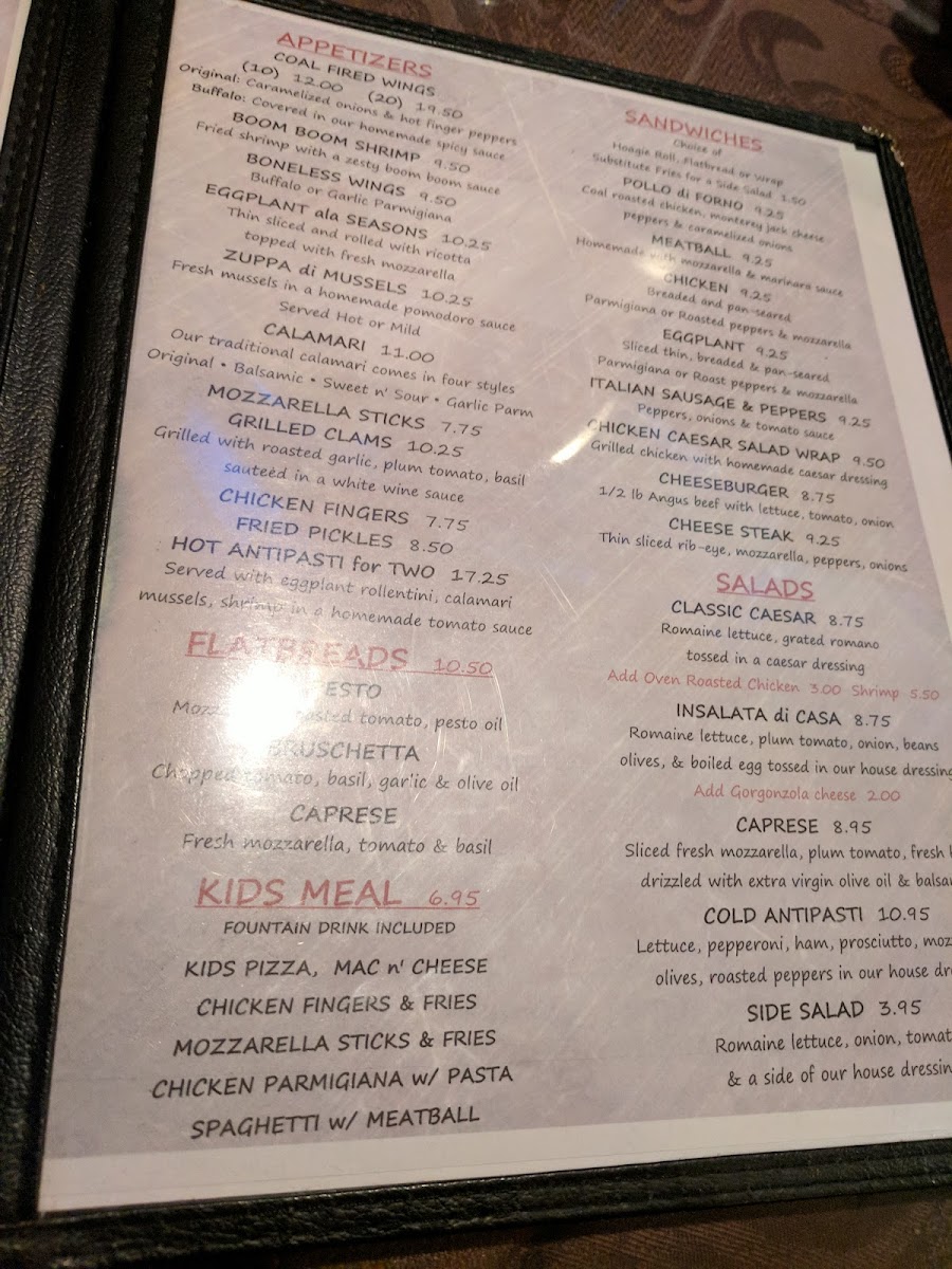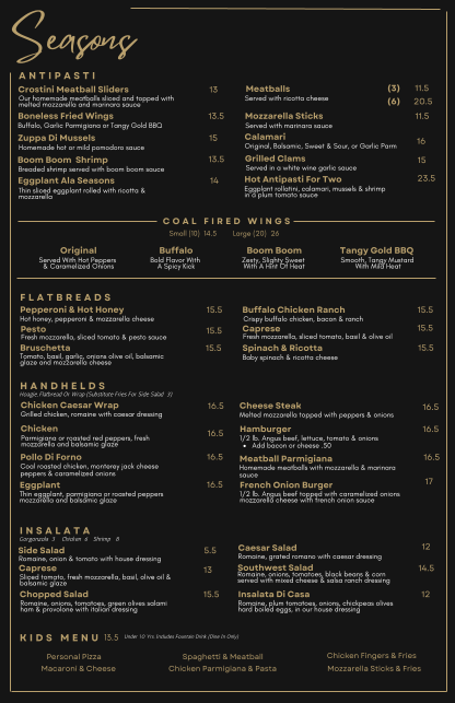 The menu at Seasons Coal Fired Bistro offers a variety of Italian-inspired dishes, featuring a selection of traditional and contemporary options. It includes several distinct sections to cater to different dining preferences and dietary needs.