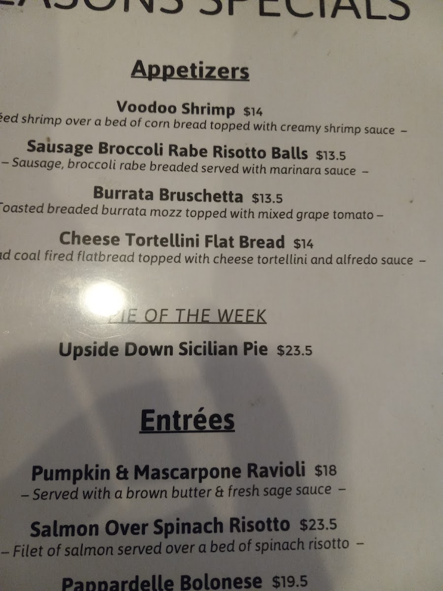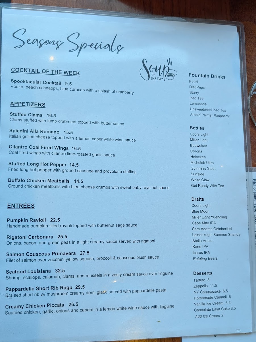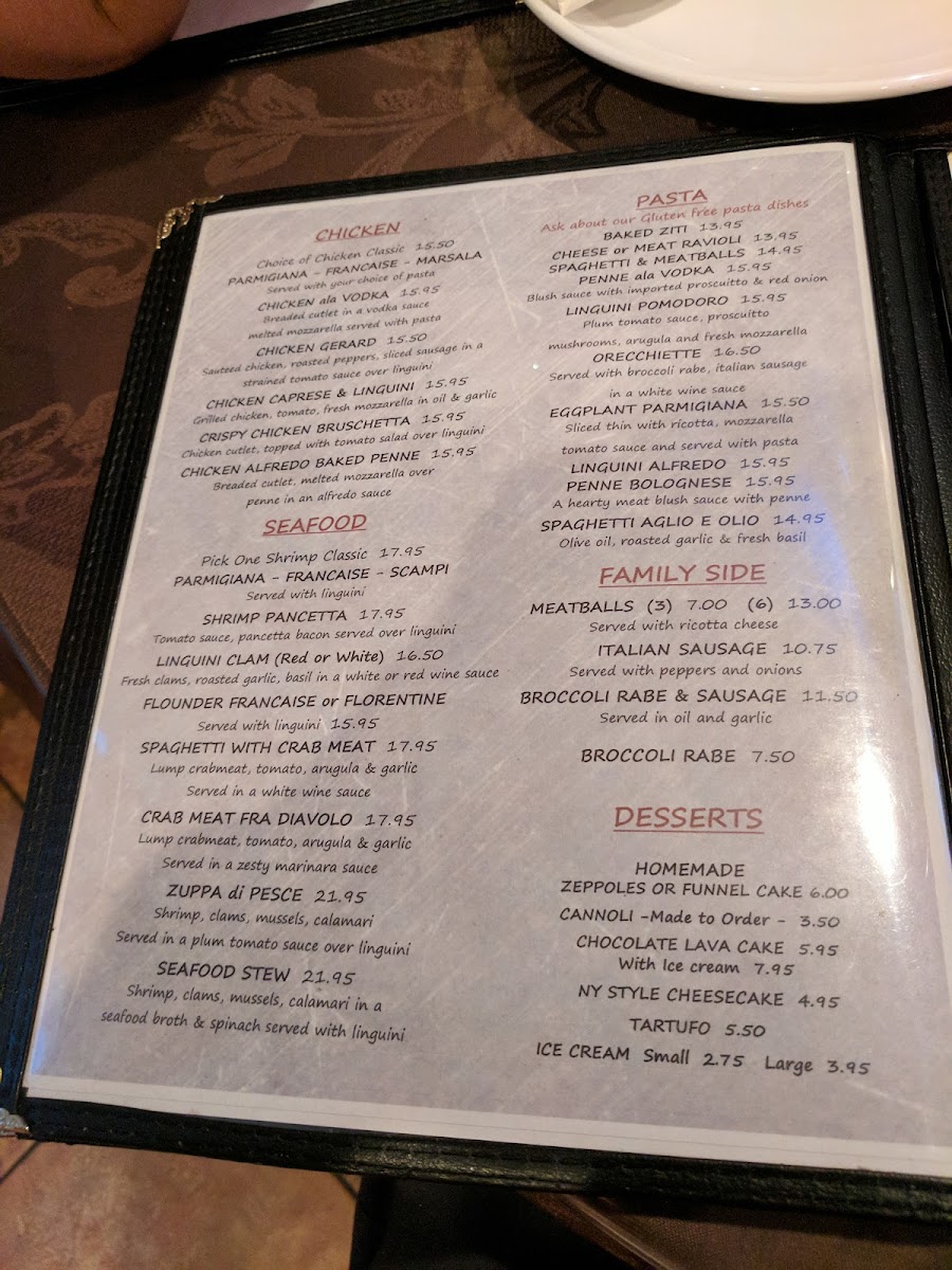 Additional Italian specialties featured on the menu include pasta dishes such as Penne Vodka, Linguine with Clam Sauce, and Valentine’s Raviolis, as well as classic entrees like Chicken Marsala, Veal Parmigiana, and Short Rib with Risotto. Appetizers include Fried Calamari, Clams Oreganata, Buffalo Boneless Fried Wings, and Side of Meatballs.